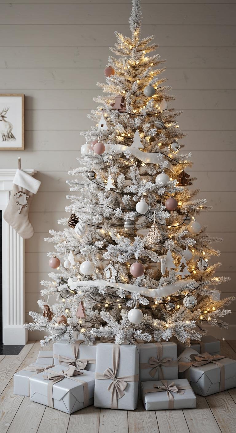 The Scandinavian style is all about simplicity and nature wrapped in calm vibes. Picture a slim tree with delicate branches, decorated in muted colors like soft pastels and whites, with wooden ornaments and minimal geometric shapes. Keeping those warm lights going is key for that snug atmosphere. A simple linen or wool tree skirt ties it all together, plus hanging dried flowers or homemade paper stars adds that thoughtful, handcrafted twist. It’s peace, harmony, and holiday magic all rolled into one.
