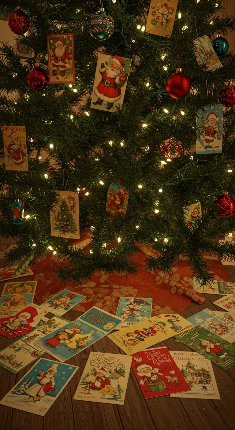 Don’t stash those vintage Christmas cards away! Displaying them around or under your tree wraps your space in sweet holiday memories. Use a decorative box or an old crate to keep them tidy yet visible. You could even string some cards across your tree branches with twine for a personal, whimsical touch that’s full of heart.