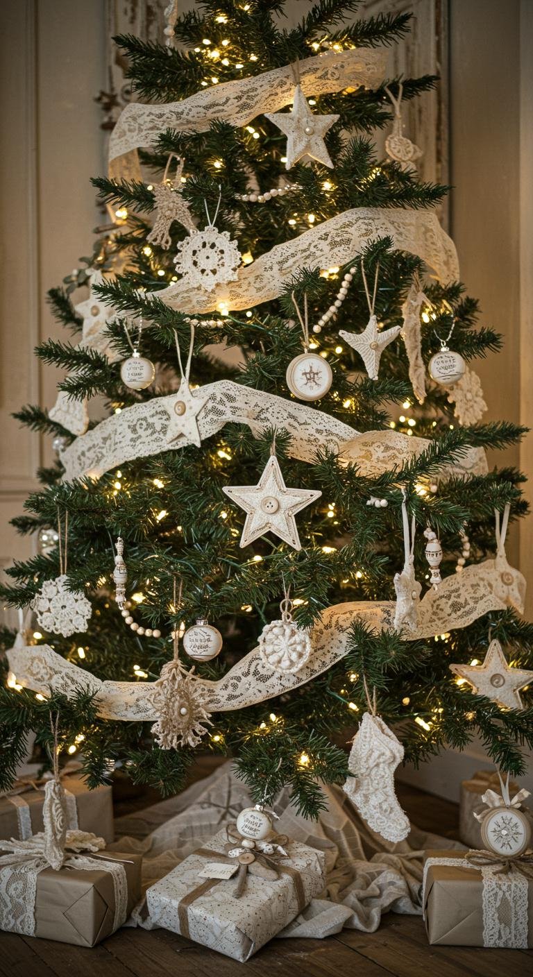 If you lean toward something softer and sweeter, shabby chic is your best friend. Think lace, delicate fabrics, and pastel colors. Old lace curtains can be repurposed as delicate garlands or draped gently over your tree. Fabric scraps make great handmade ornaments, adding a cozy, personal touch that feels like a warm vintage hug.