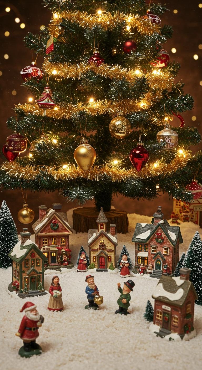 Setting up a tiny Christmas village under your tree? So cute and totally old-school! Hunt for miniature houses and knickknacks at thrift shops to build your scene. Displaying them on something like an old tray or mirror adds a little extra sparkle. When you throw in battery-powered lights, the whole village comes alive, drawing everyone’s eyes and sparking stories that make your holiday decor extra special.