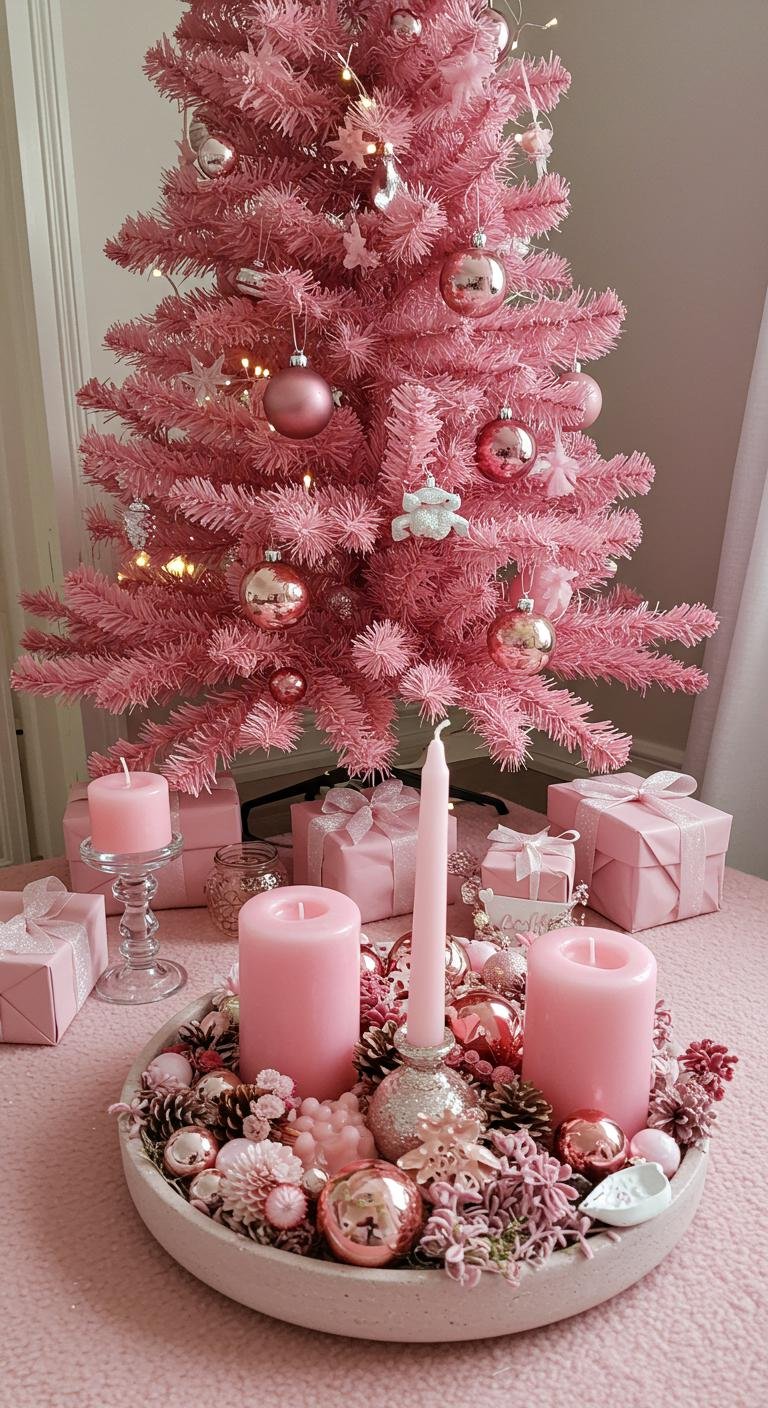 Extend the pink holiday magic beyond the tree with charming centerpieces. Gather candles, ornaments, and greenery in shades of pink, and arrange them on stylish trays or festive tablecloths. Mason jars filled with pink accents or pinecones spray-painted pink add gorgeous natural touches. These small details tie the room together, making everything feel coordinated and totally festive.