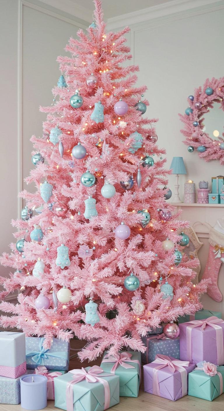 Pastel pink trees are a total mood, especially when you dress them up with soft lavender and baby blue ornaments. Think glossy finishes that catch every bit of twinkle and light. For a little extra charm, mix in vintage touches like lace or burlap ribbons—you know, things that feel handmade and lived-in. Even better? Add some ornaments you or the kids have crafted for that priceless personal touch. This one’s a total dream for children’s rooms or anyone wanting to channel their inner kid again!
