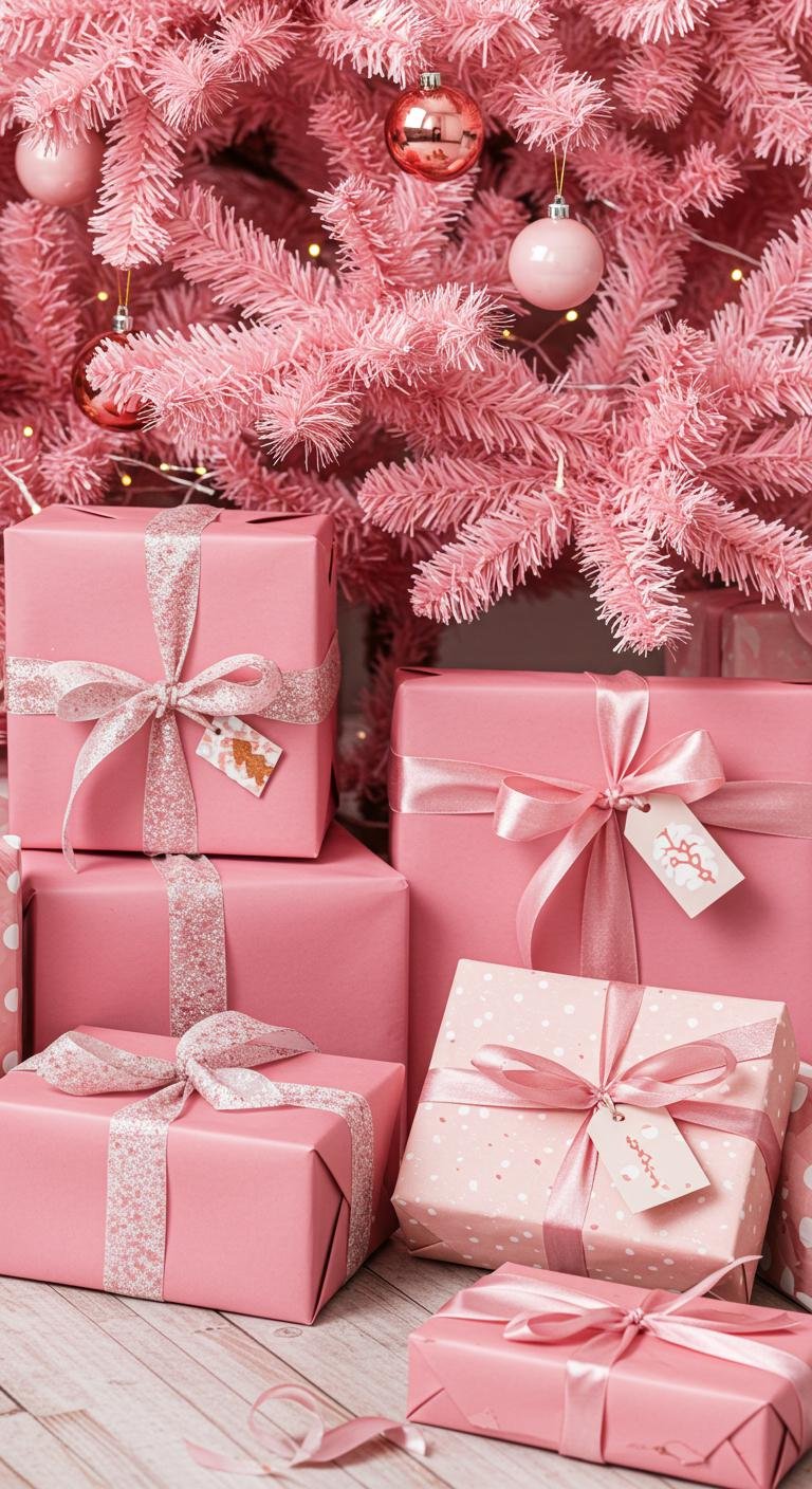 Let’s talk gifts that vibe perfectly with your pink tree! Choose wrapping papers in shades that match or complement your decor. Get crafty with hand-stamped gift tags and bows made from fabric scraps lying around. For a rustic contrast, swap ribbons for twine—it’s a cute little twist that guests will definitely notice. You can even personalize each present with unique name tags—hello, next-level thoughtful packaging!