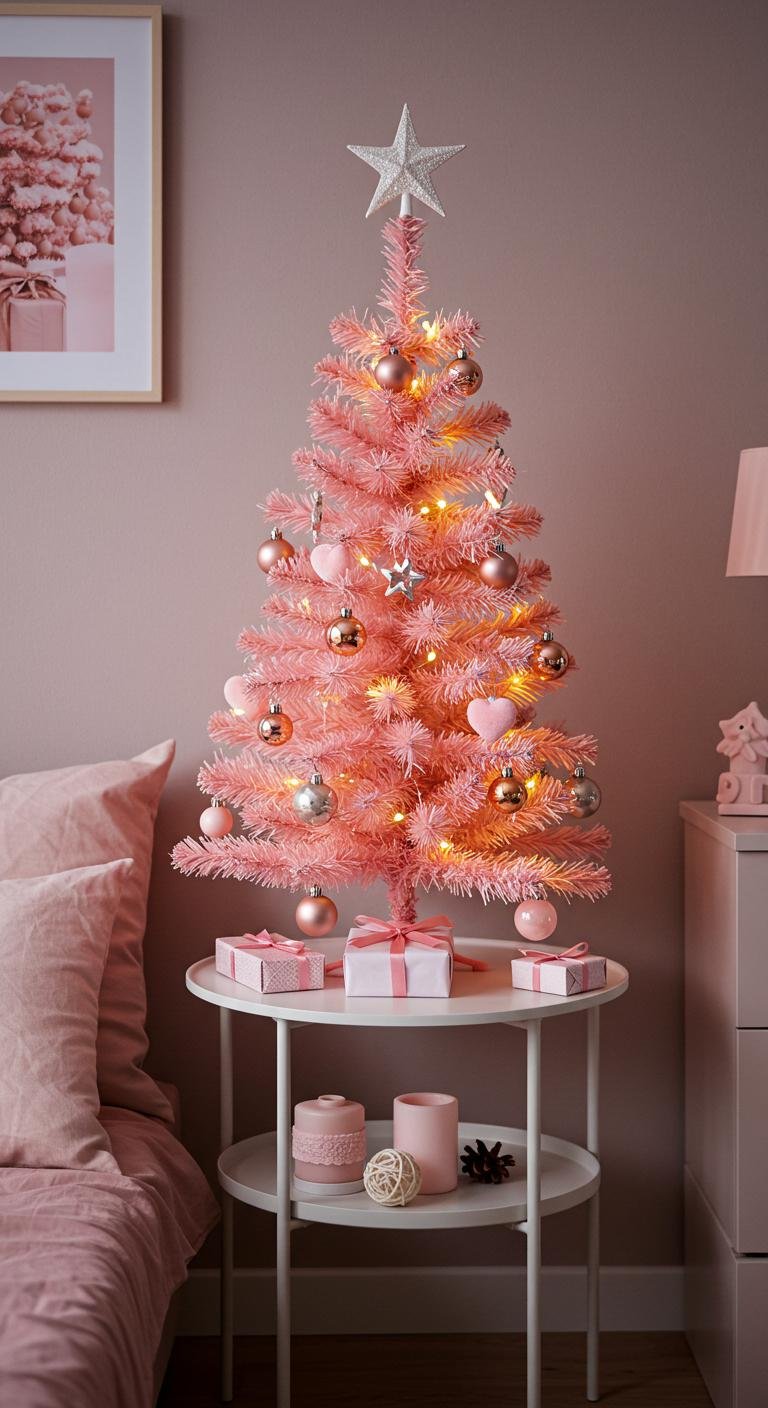 Short on space? No worries. Mini pink trees are adorable and pack a big style punch. Perfect for apartments, dorm rooms, or anywhere that needs a touch of cheer without taking over. Use tiny ornaments, delicate fairy lights, or even handmade crafts to personalize it. Hunting vintage ornaments in thrift shops adds character and a little story to your petite tree. Small space, big holiday spirit!