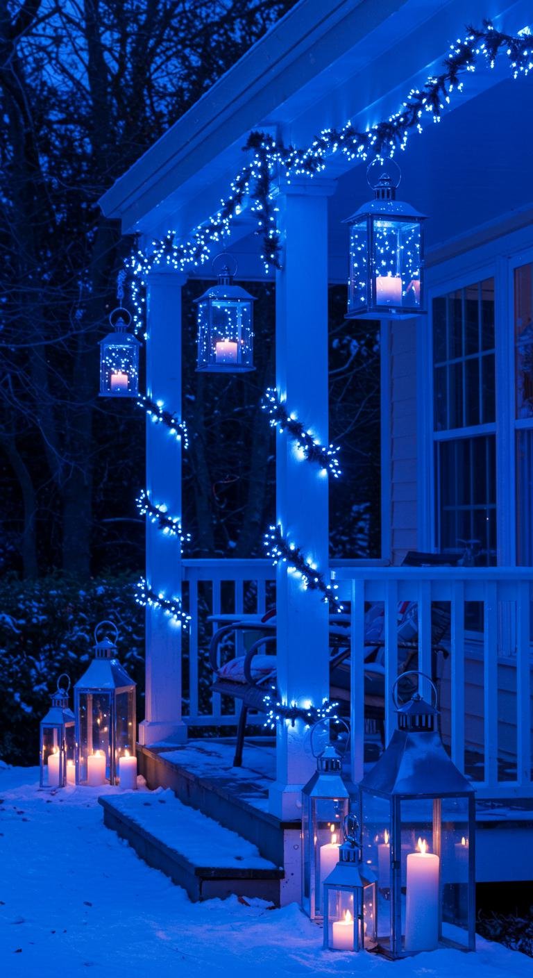 Imagine draping vibrant blue light fixtures across your porch while hanging shimmering silver lantern designs that sway gently in the breeze.