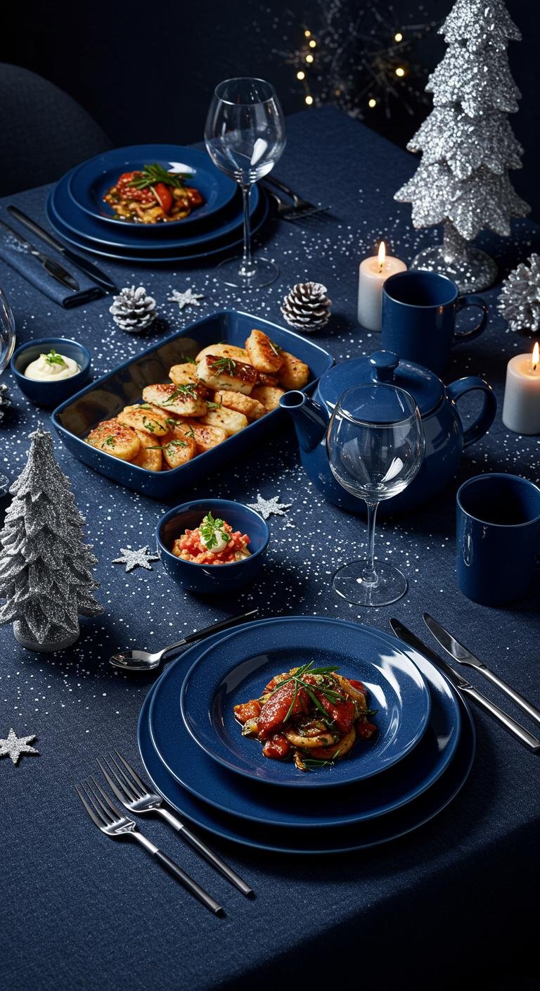 Picture shimmering accents against rich shades of blue, creating a stunning backdrop for your culinary creations amidst this enchanting winter wonderland.