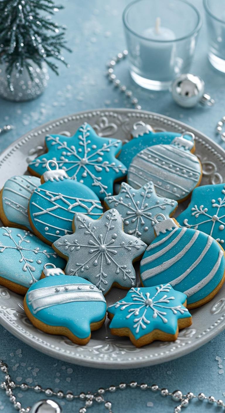 Imagine a festive platter adorned with stunning silver and blue themed Christmas cookies, each one a delightful work of art.