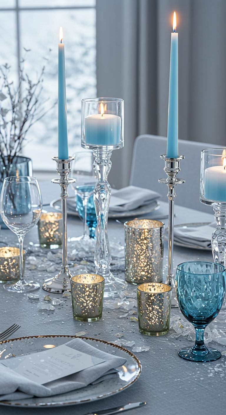 Consider candle holder alternatives like sleek metallic geometric designs or delicate glass options, which harmonize beautifully with your winter theme.