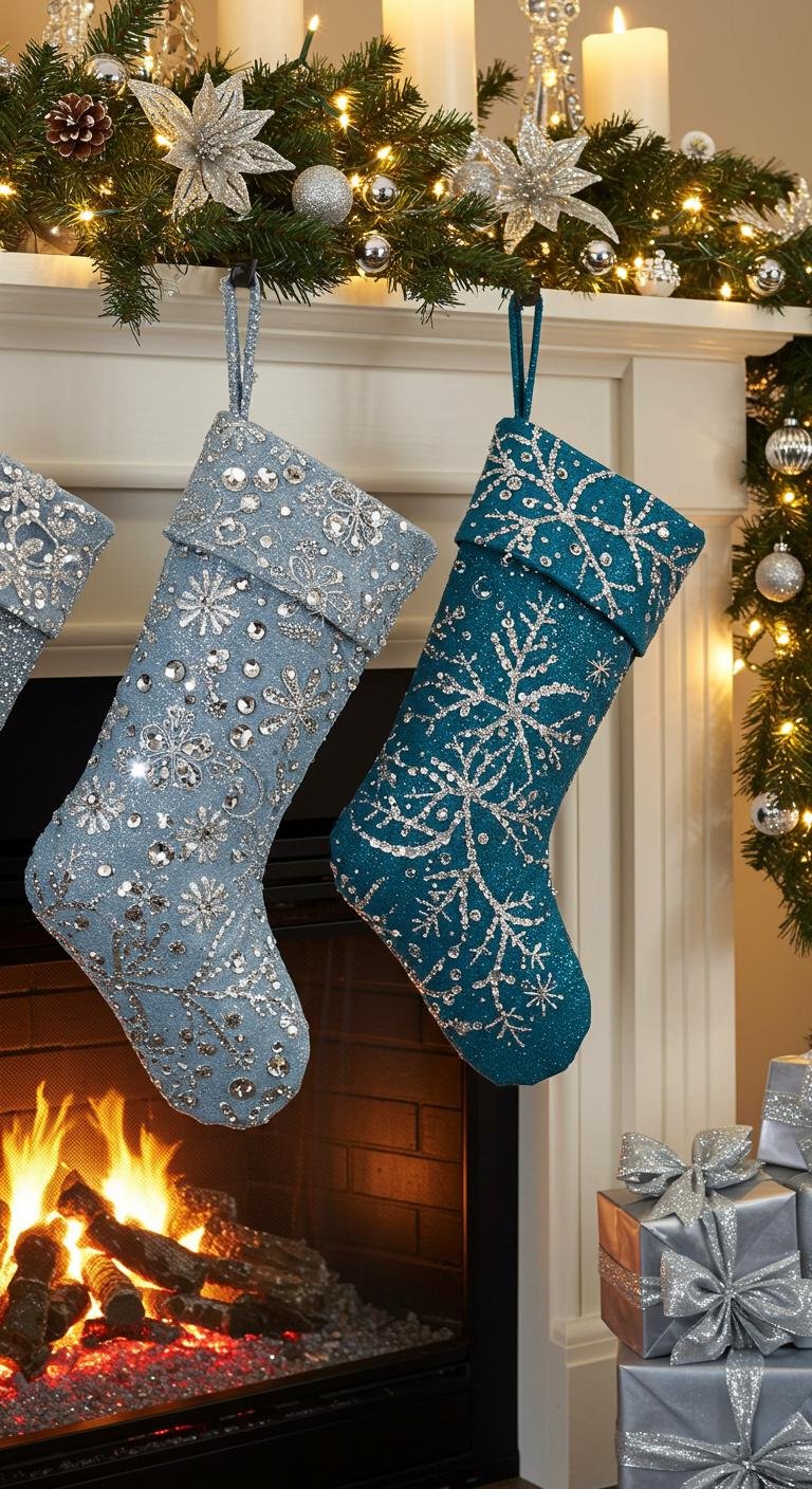 Draped lovingly over the mantel, blue and silver stockings bring a touch of magic to your holiday décor.
