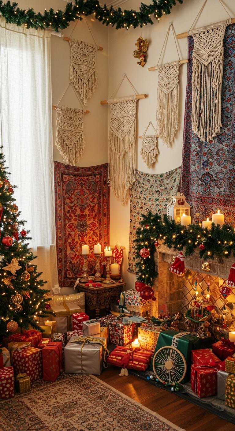 To create a boho-chic atmosphere this Christmas, incorporate whimsical wall hangings that reflect your unique style.