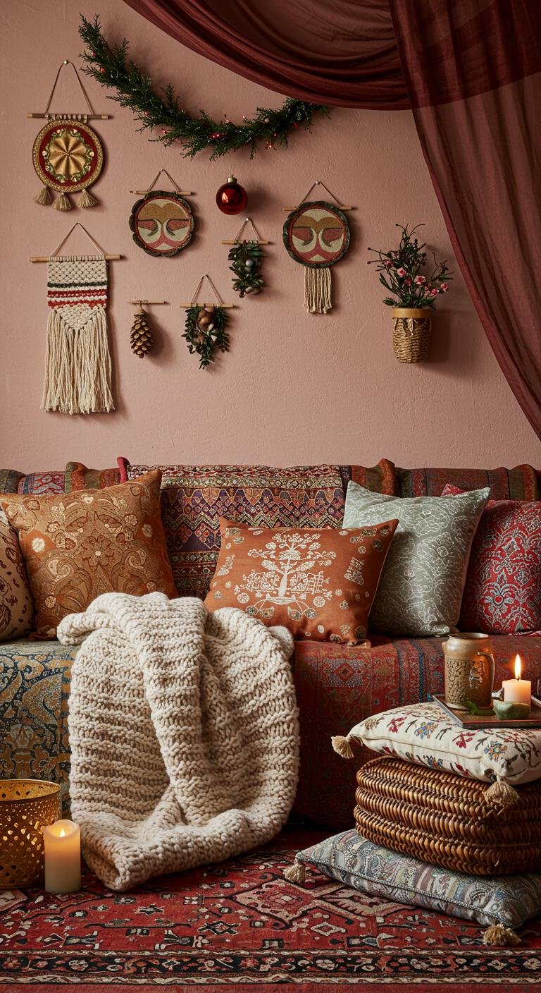 To elevate your boho Christmas decor even further, incorporating vibrant and eclectic throw pillows can add a delightful touch of comfort and style to your living space.