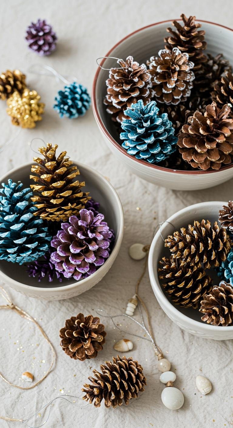 There’s something magical about dipping pinecones in paint or glitter to create unique holiday decor. You can release your creativity with easy dipped pinecones crafts that serve as charming accents. Try pastel hues for a soft touch or metallic for added glam. For pinecone decor tips, cluster your creations in mismatched bowls or hang them as whimsical ornaments, embracing that laid-back boho vibe.