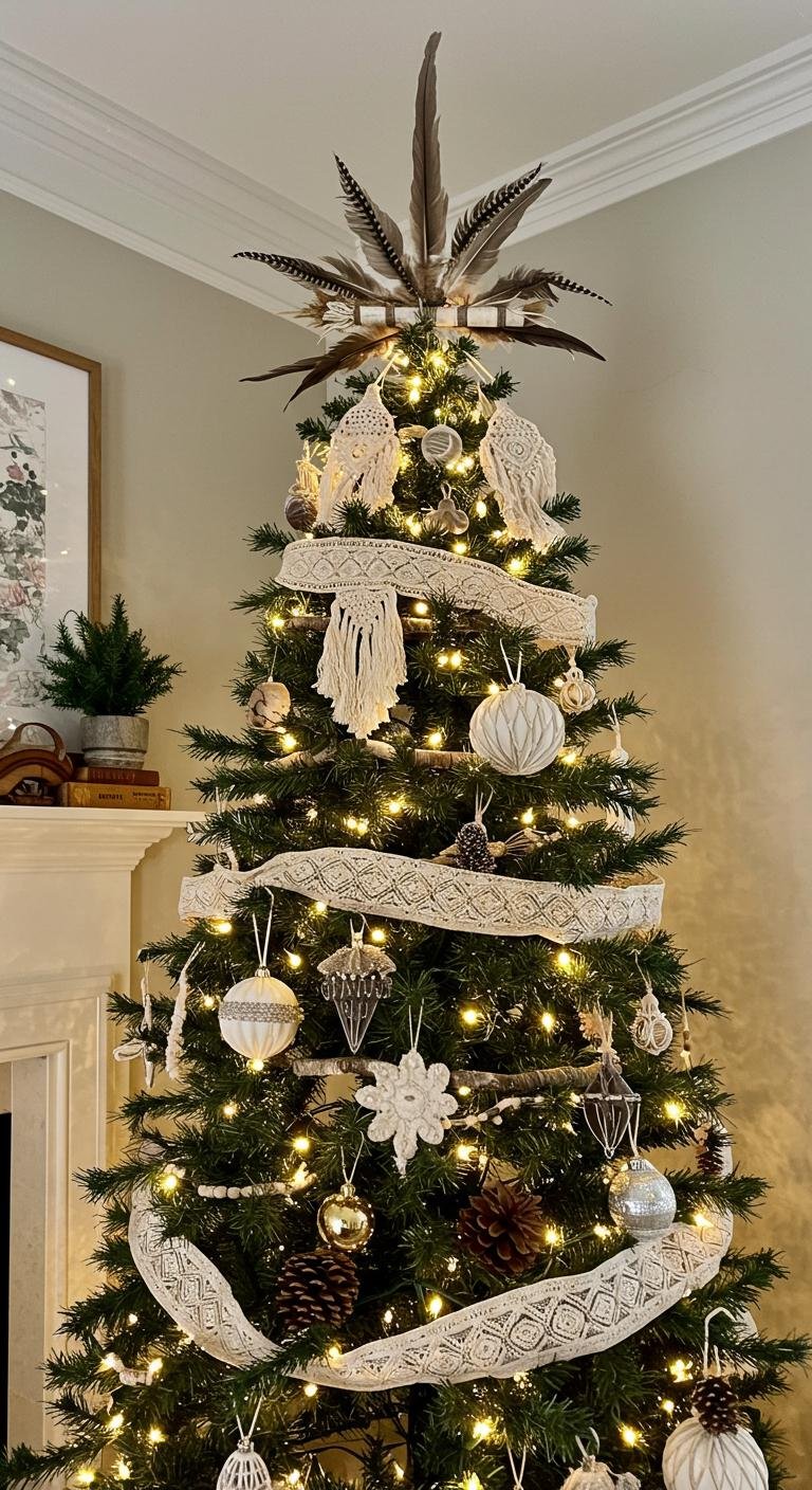 Choose a stunning design made from organic materials like wood, feathers, or woven textiles to adorn your boho tree.