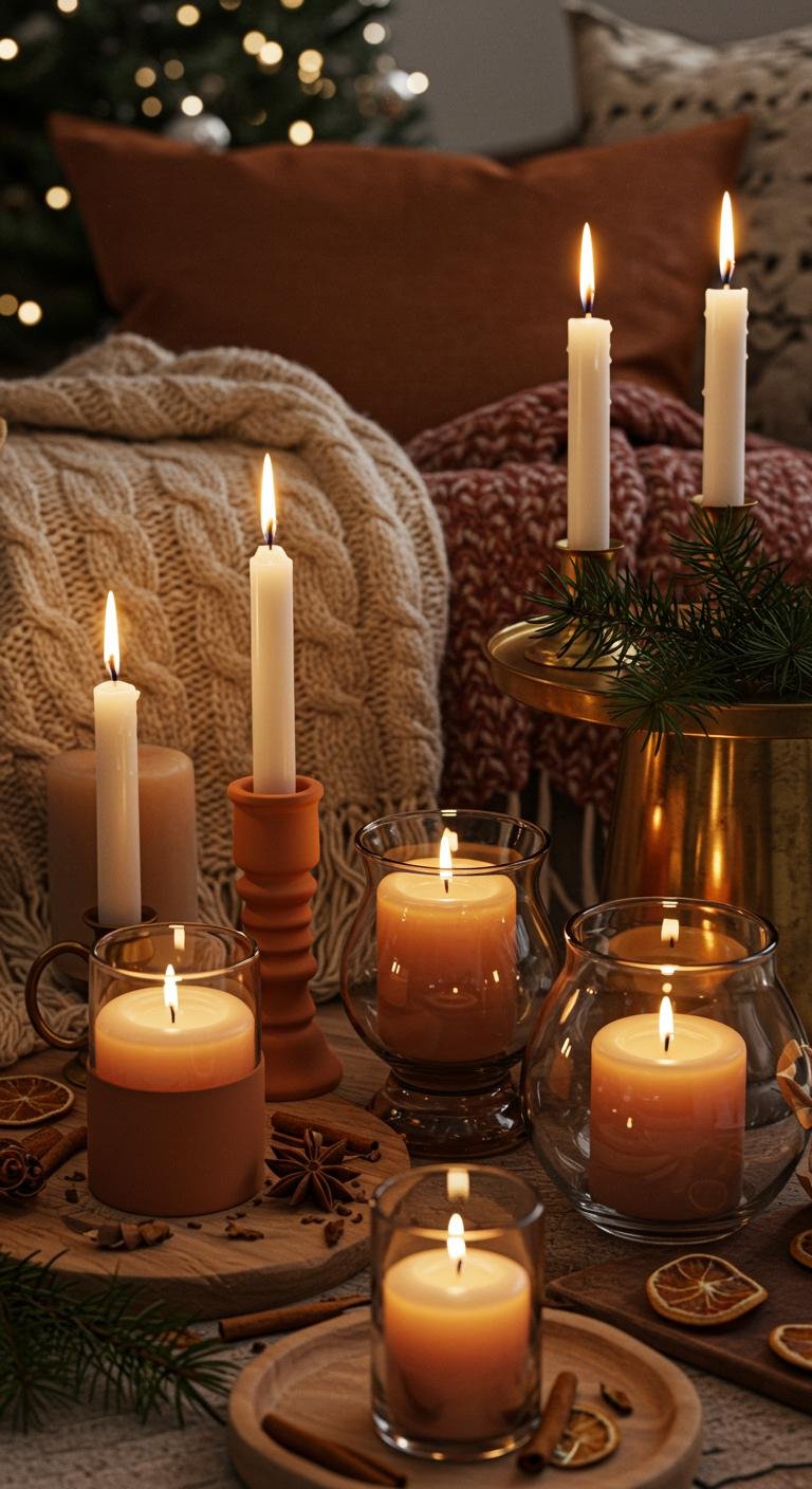 Mix various candle holders—think terracotta, glass, and metallic—for an eclectic look. Choose inviting candle scents like cinnamon, pine, and vanilla to create a warm atmosphere.
