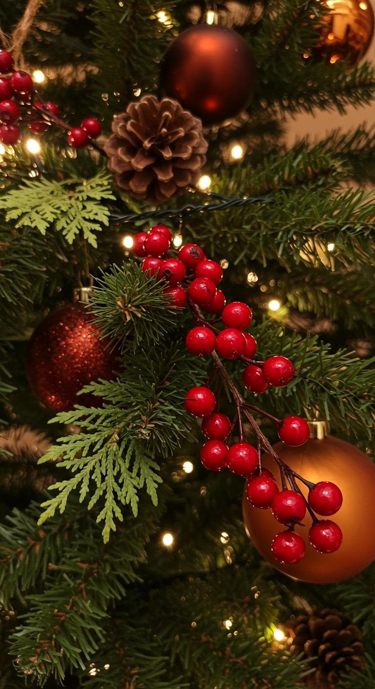 To keep things lively, bring in natural pops of color like faux berries, rich green sprigs, or dried flowers. You can find small bouquets at craft stores and clip them to perfectly fit your tree. Mixing these with your brown decorations gives everything a fresh, balanced feel. Plus, this is a budget-friendly way to add vibrancy without losing that earthy charm.