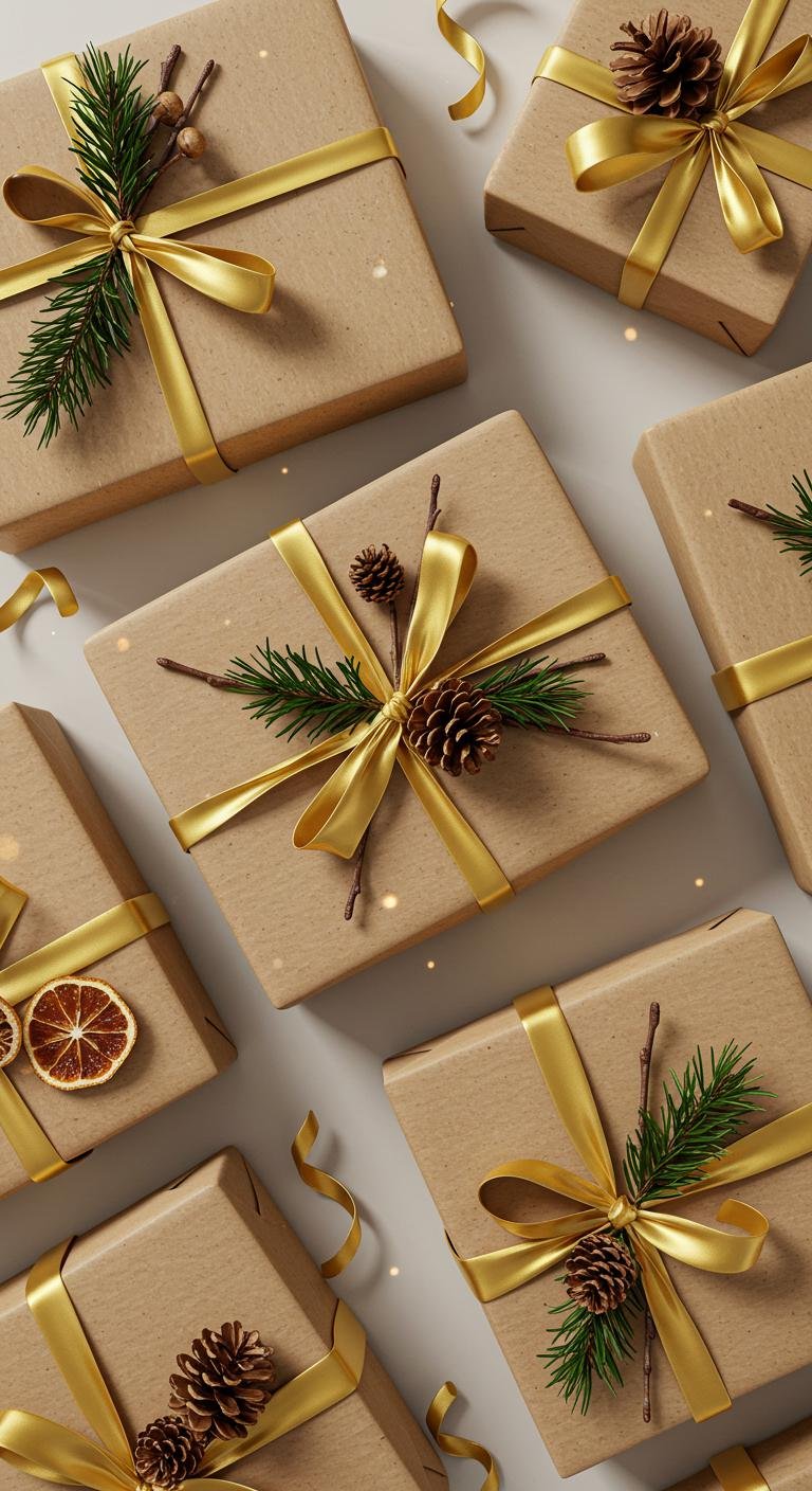 Take the brown craft paper route for wrapping and add gold ribbons or twine on top. Then tuck in sprigs from evergreens or small pinecones to match your tree’s vibe. It’s an eco-friendly, gorgeous way to tie the whole holiday look together—plus, it feels kinda special unwrapping these gifts.