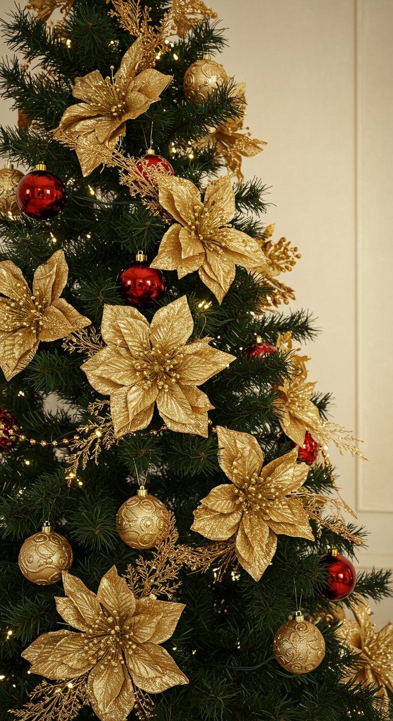 Adding gold-toned branches or floral picks pretty much instantly upgrades your tree’s style. You can grab faux flowers or even make some from fabric for a whimsical touch. It’s subtle but adds that extra polish without going over the top.
