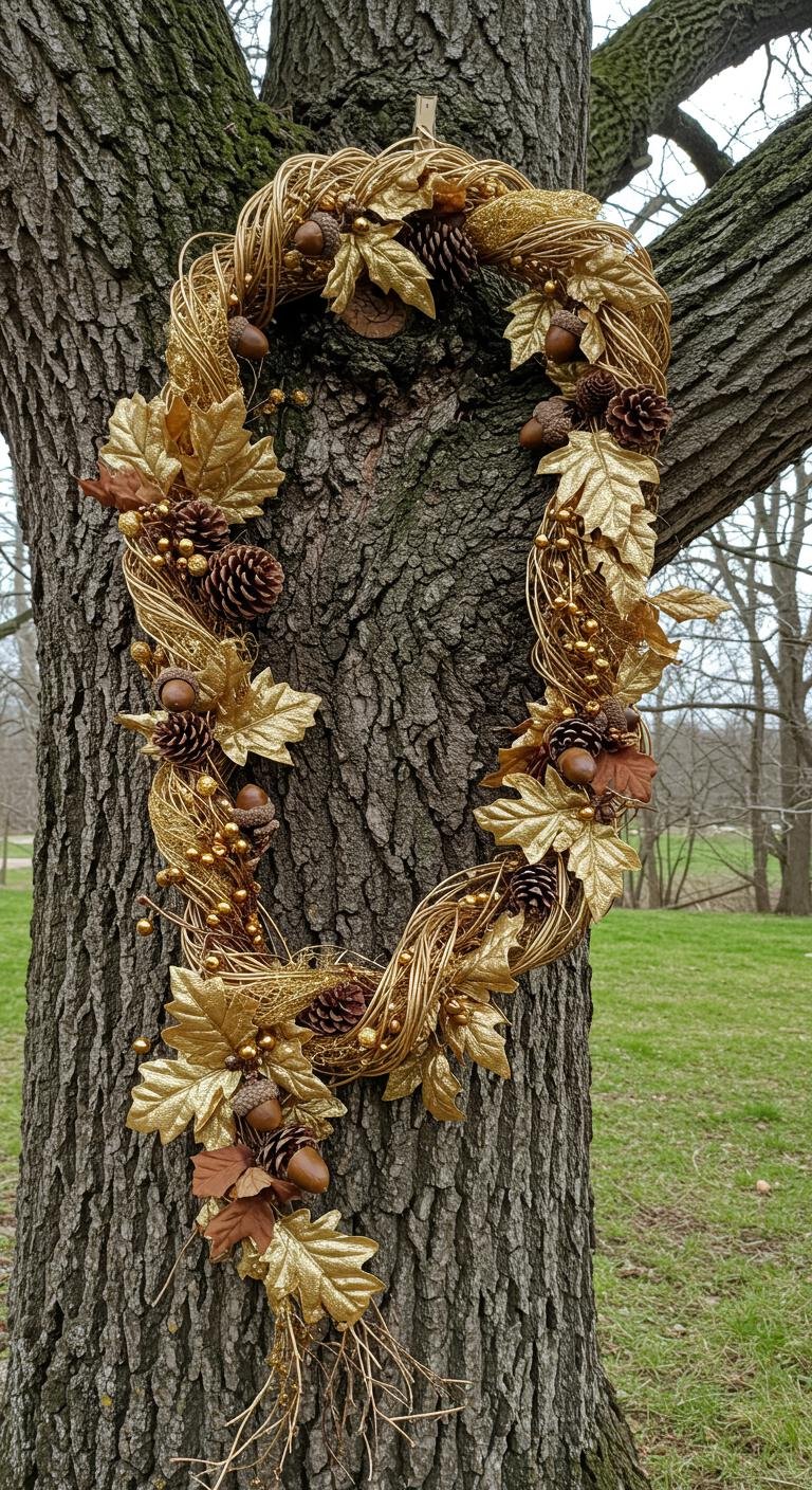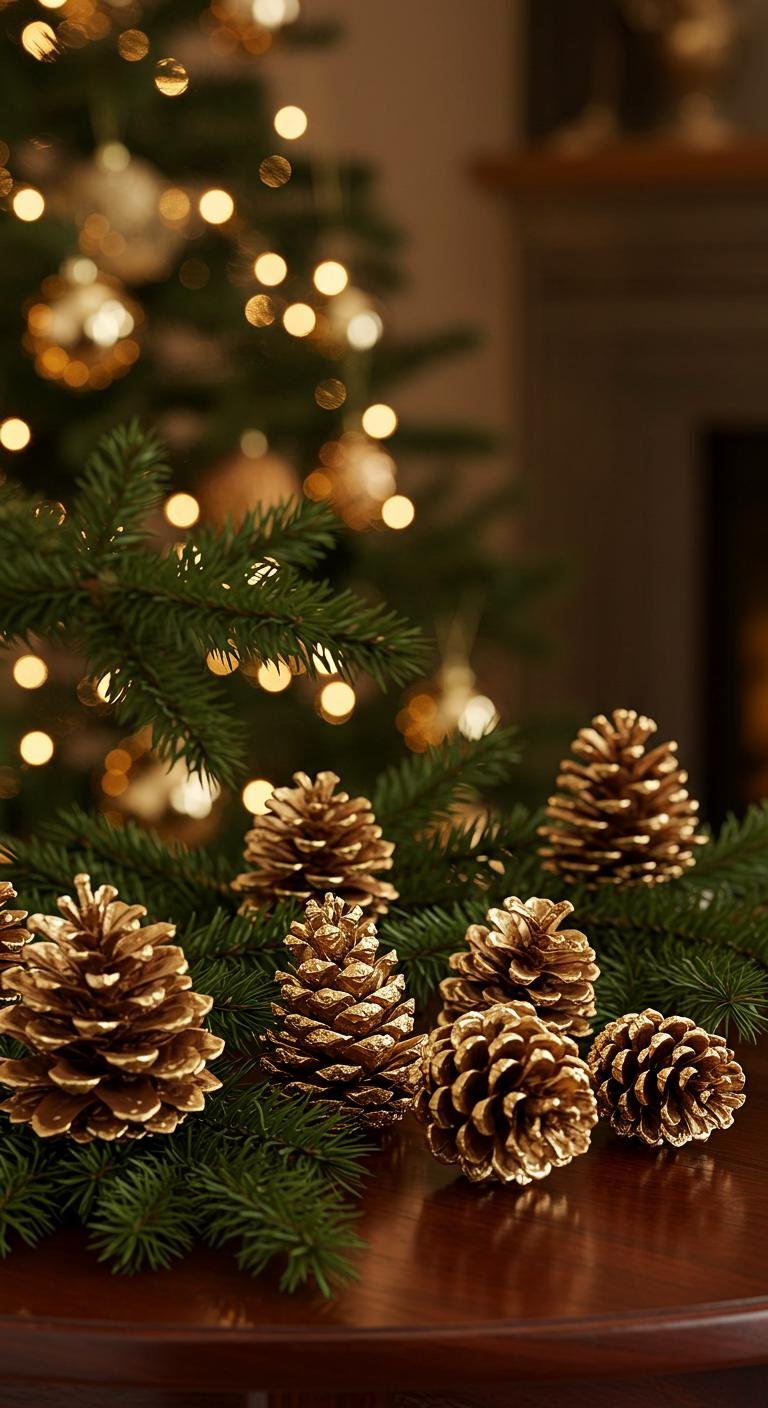 I love the idea of dipping pinecones in gold paint—it’s easy and gives this whimsical contrast to all the earthy browns. Just add a clear hook and hang ’em up. It’s such a fun little project that mixes nature with that seasonal sparkle.