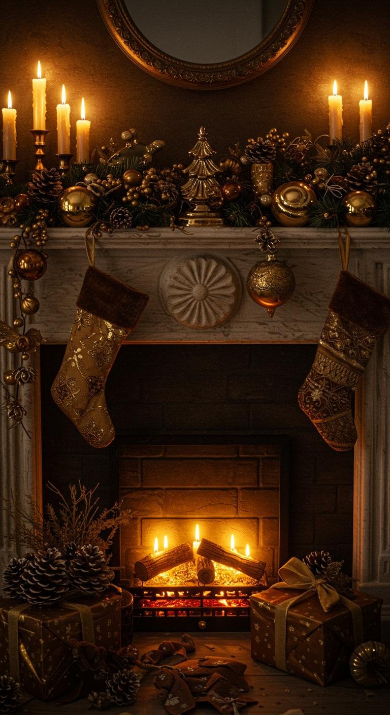 Why stop at the tree? Bring those vintage-inspired browns and golds to your mantel too. Layer natural bits with gold touches like ornate candleholders or other decorations. You don’t need a ton—just a few well-placed pieces create an elegant, cohesive vibe for the whole room.