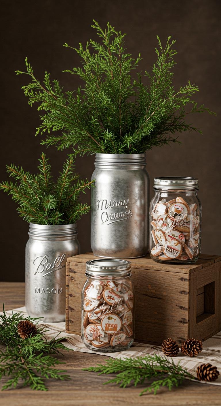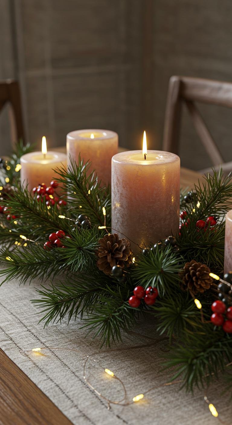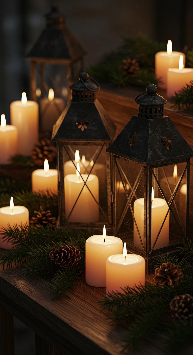 Candles and lanterns really bring that warm, inviting glow to any holiday setup. Arrange candles of different heights on a wooden tray and surround them with natural bits like pinecones or berries. Rustic metal or wicker lanterns add even more charm. Don’t toss those empty mason jars — wrap twine around their necks and use them as cute candle holders. It’s such an easy way to add soft light and cozy vibes, perfect for making any corner feel festive and welcoming.