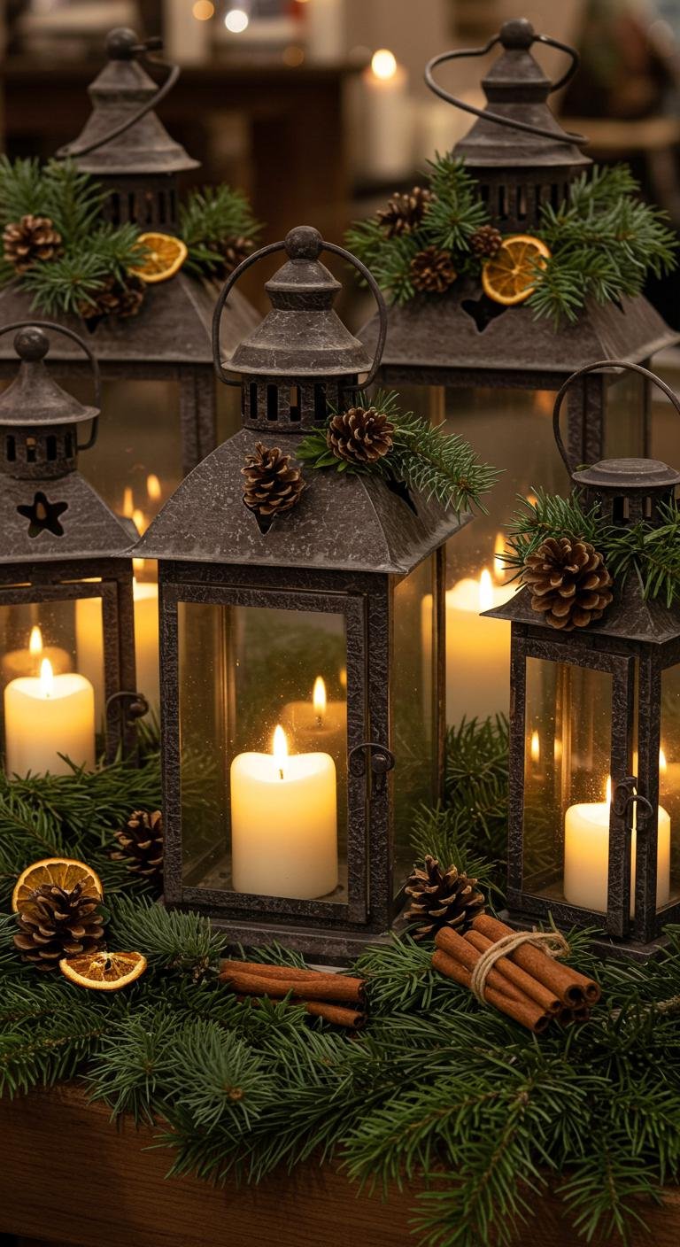 Lanterns are fantastic for adding cozy lighting in a rustic setup. Fill them up with candles or twinkling fairy lights for a soft glow. For that extra holiday spirit, tuck small ornaments or sprigs of seasonal greenery inside. Hang a few at different heights with twine for a magical effect. It’s an effortless way to brighten your space and feel the warmth of the season without stretching your budget.