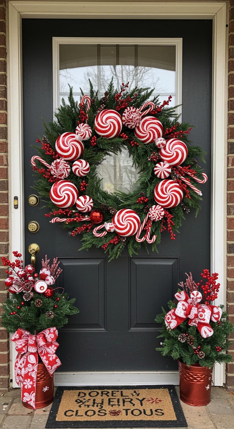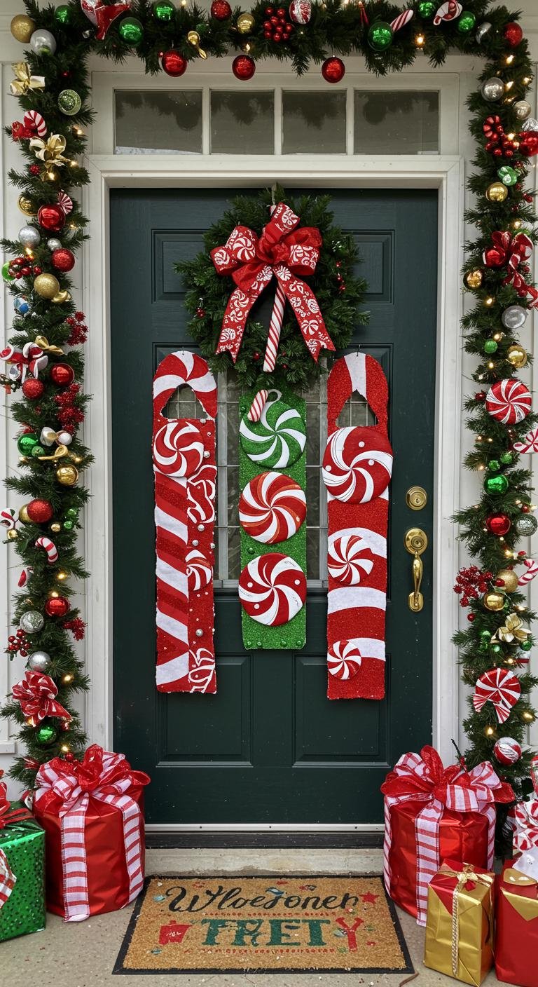 Explore playful candy cane patterns, ensuring your door’s a showstopper, welcoming everyone with whimsy and warmth this holiday season.