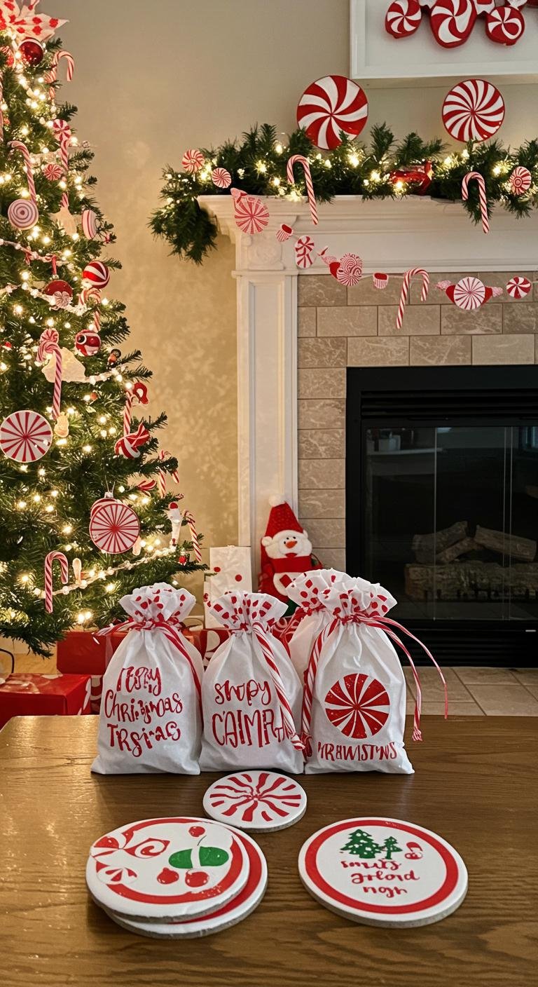 Don’t forget to whip up delightful candy cane gifts, like personalized treat bags or festive coasters. Embrace your creativity, and let these sugary designs infuse your holiday season with joy and cheer!
