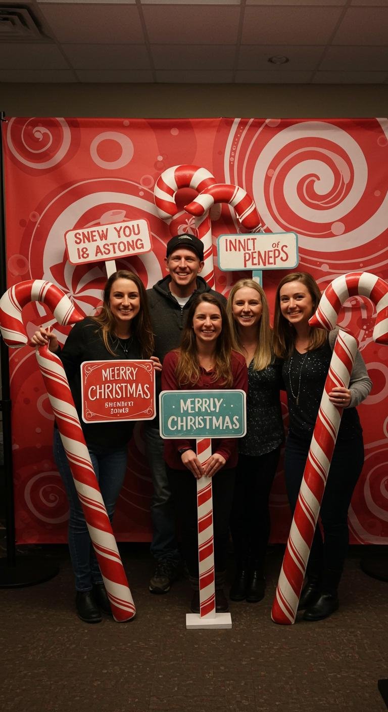 Get ready to sweeten up your holiday gatherings with a fun candy cane photo booth that’ll bring smiles and laughter to your festivities! Use oversized candy cane props and playful signs for striking candy cane photography. Pair them with a vibrant, festive backdrop filled with swirls of red and white, creating the perfect setting for unforgettable moments. Capture the joy and let the holiday spirit shine!