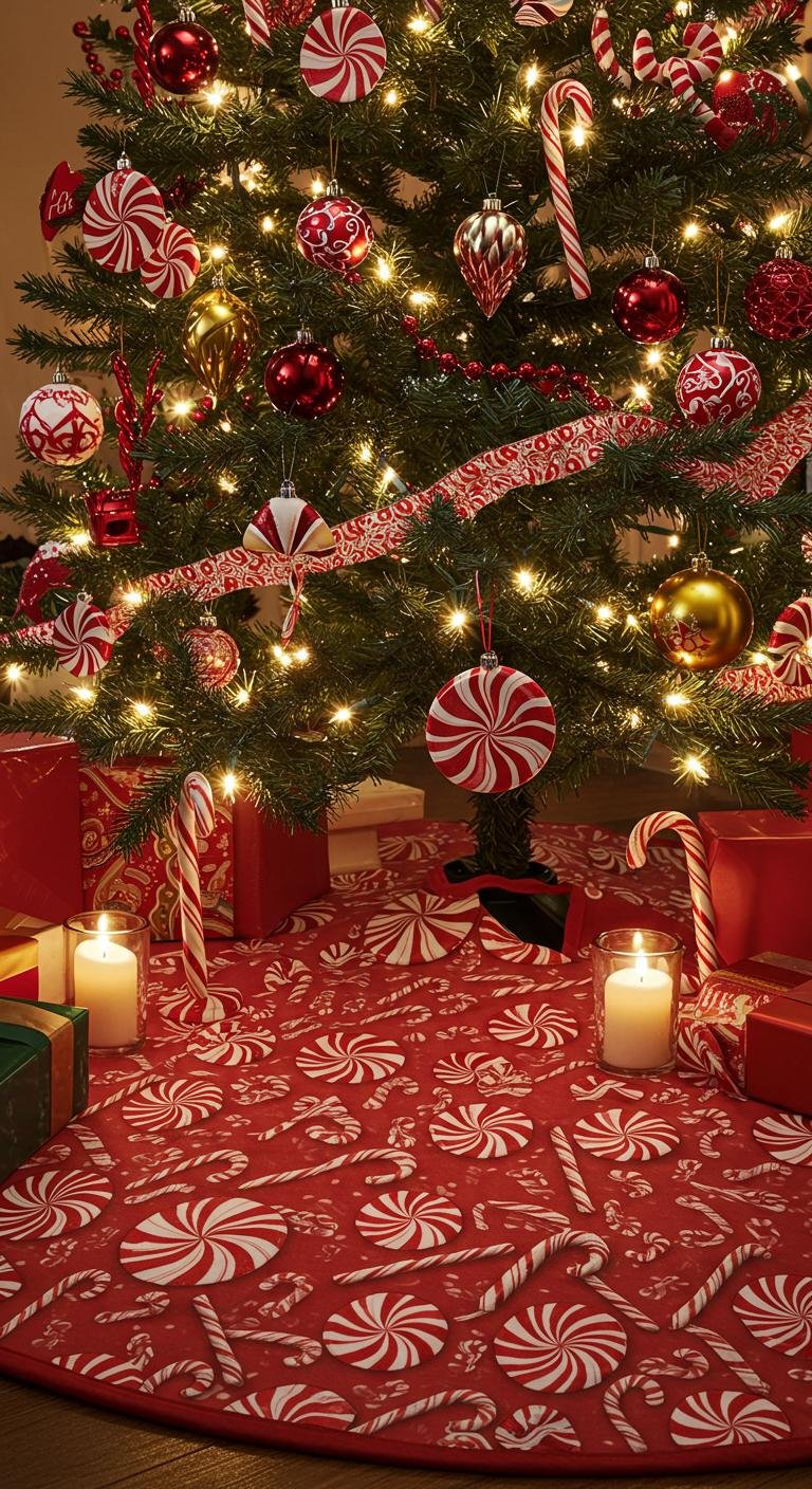 After setting the mood with whimsical candy cane candle holders, it’s time to elevate your holiday decor with a colorful candy cane tree skirt.