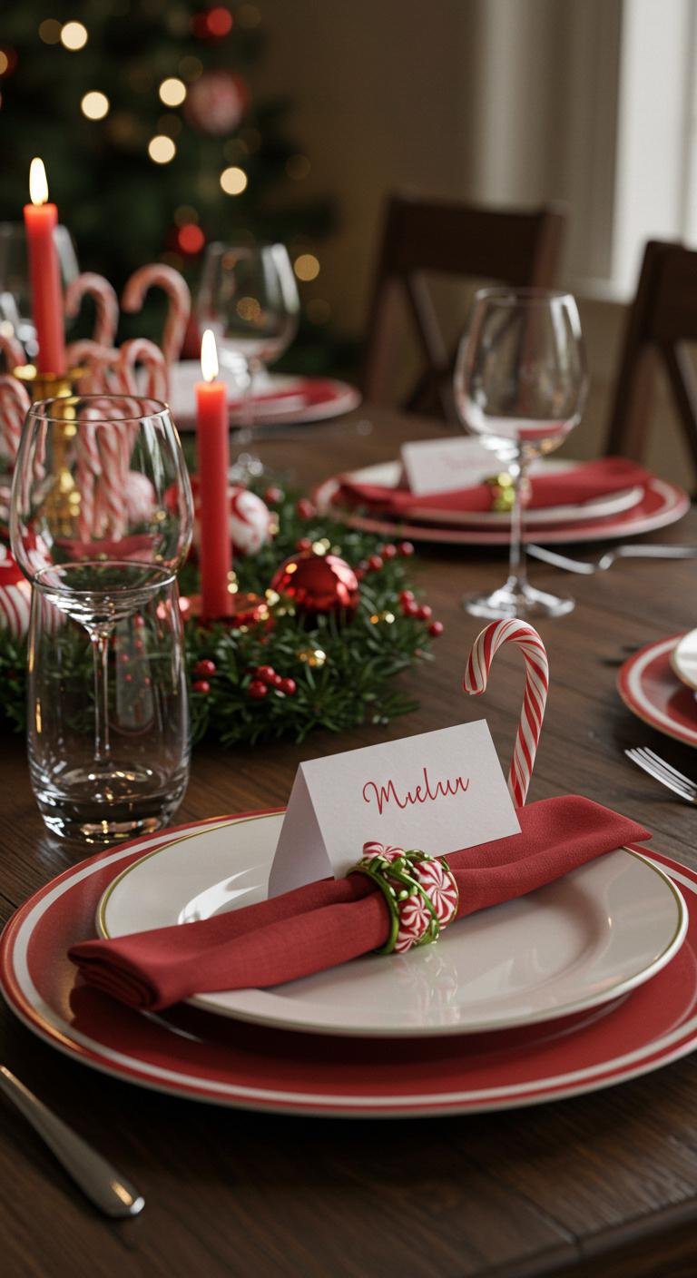 Picture vibrant candy cane plates that bring cheer, paired with whimsical candy cane napkins gently rolled and tied with festive ribbons.