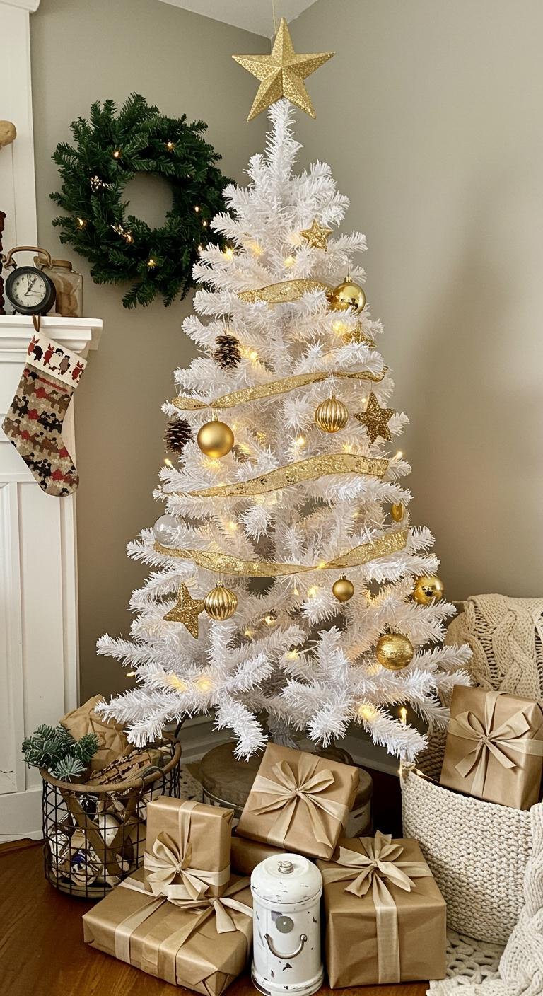 Rustic farmhouse style is all about warmth, so start with your white tree and add gold touches paired with natural wood ornaments and burlap ribbons. It gives this laid-back, cozy vibe that’s irresistible. You can easily DIY ornaments by cutting or painting festive shapes on reclaimed wood—super cute and thrifty! Soft white lights help bring out the gentle, homey feel. This look makes your space feel welcoming and perfectly festive.