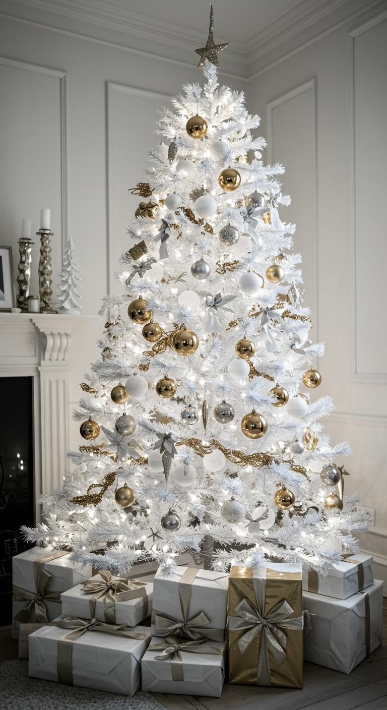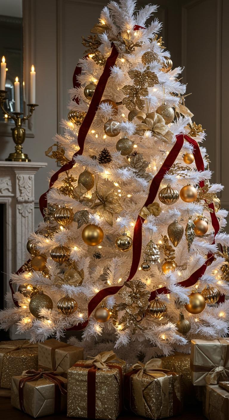 For a bit of edge, mix gold and silver accents on your white tree. This combo feels sleek and contemporary without losing any holiday sparkle. You can spray paint older ornaments to pull this off without breaking the bank. Metallic ribbons or garlands bring extra shine, catching the light just right. It’s a simple trick that turns your tree into a striking centerpiece, blending elegance with a fresh, modern aesthetic.