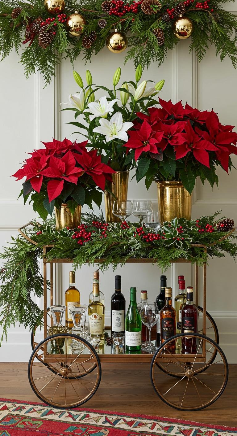 Although it may seem simple, incorporating festive floral arrangements can transform your Christmas bar cart into a vibrant centerpiece that captures the spirit of the season.
