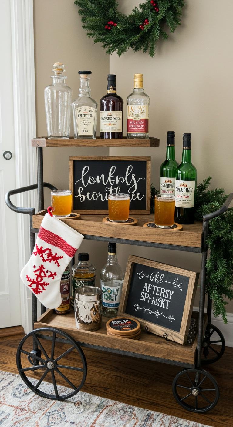 A minimalist design approach transforms your holiday bar cart into a sleek and sophisticated centerpiece.