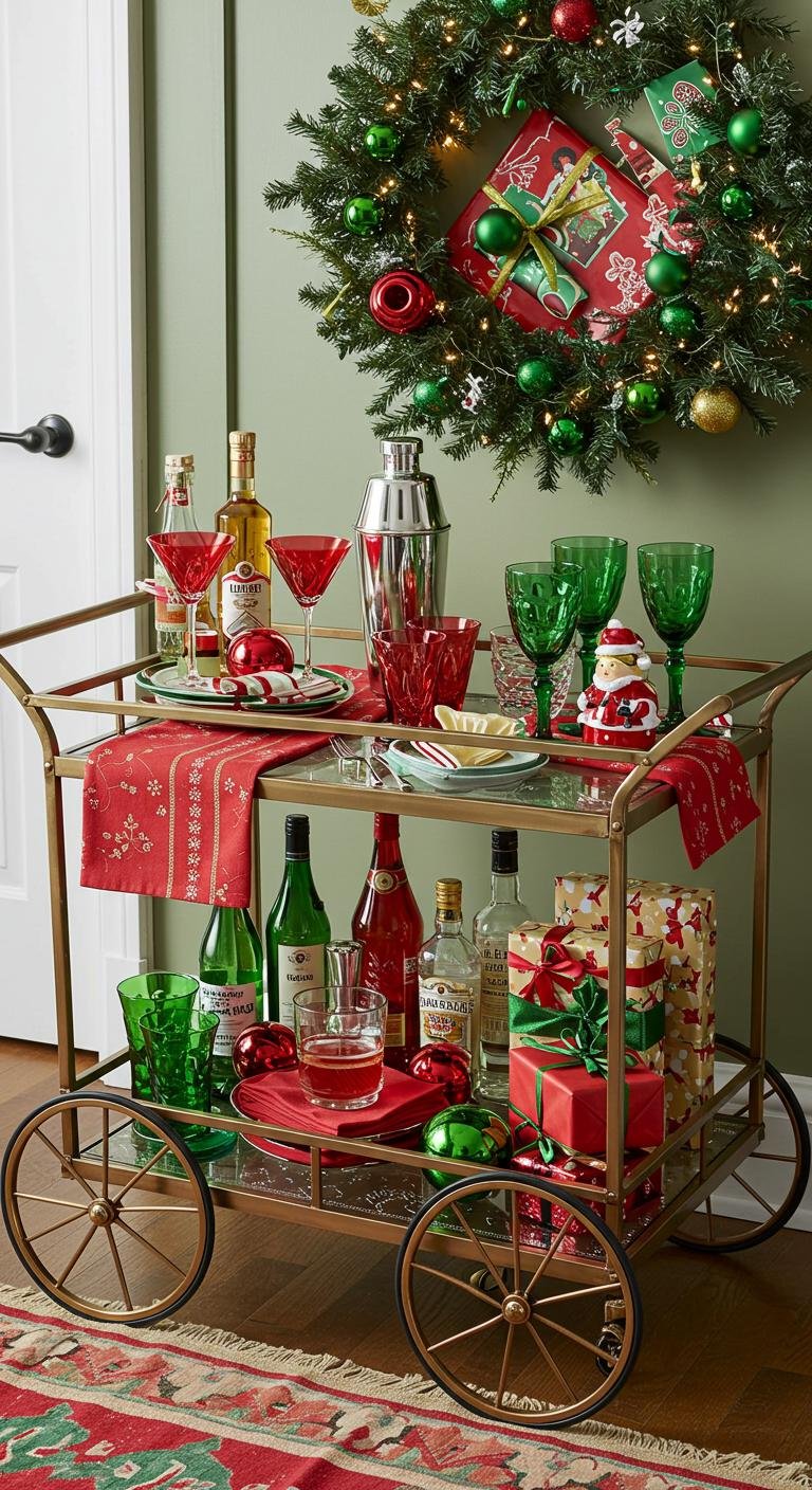 Transforming your bar cart into a festive display is easy with a classic red and green palette.