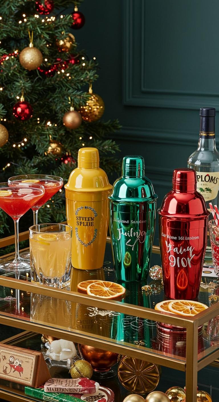 While you’re arranging your festive bar cart, think about incorporating themed cocktail shakers to elevate your drink presentation. Choose vibrant festive shaker designs that reflect the season’s spirit, sparking conversations among your guests. For a personal touch, consider personalized shaker gifts that make thoughtful mementos. These unique items not only serve a purpose but also add charm and character to your holiday gatherings.