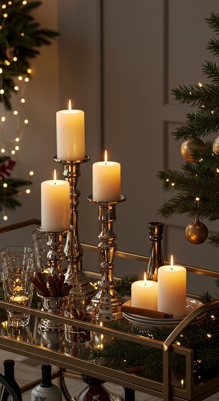 As you set the stage for a cozy holiday gathering, incorporating candle displays on your Christmas bar cart creates an inviting ambiance that’s hard to resist.