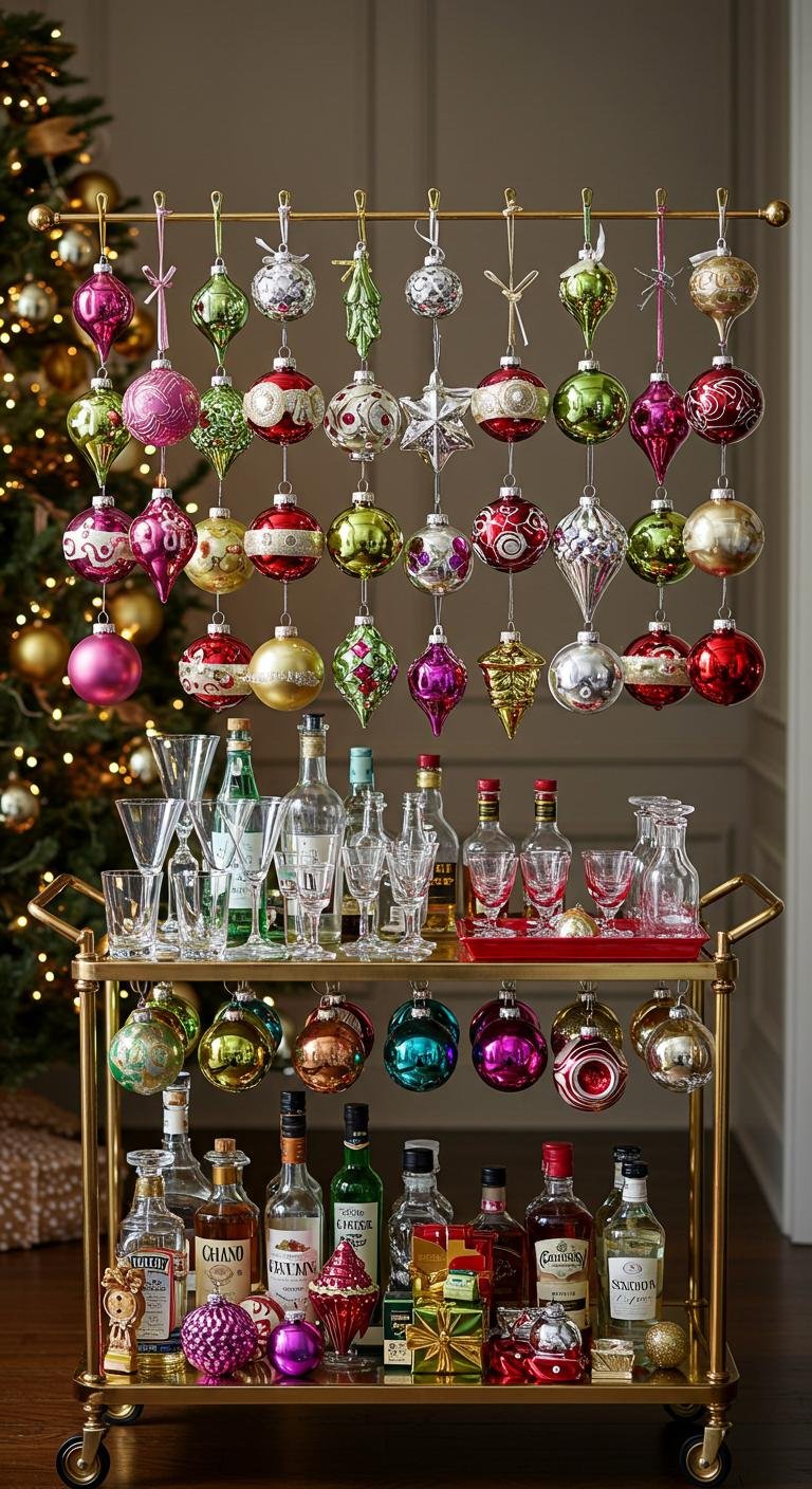 Transforming your bar cart into a festive masterpiece can be as simple as incorporating colorful Christmas ornaments.