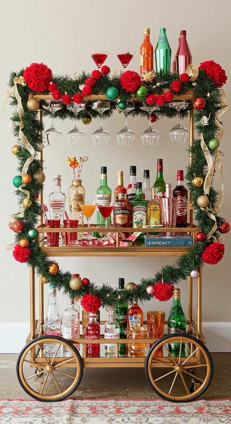 While you might think of garlands as simple decorations, they can truly elevate your bar cart’s festive charm with whimsical creativity.
