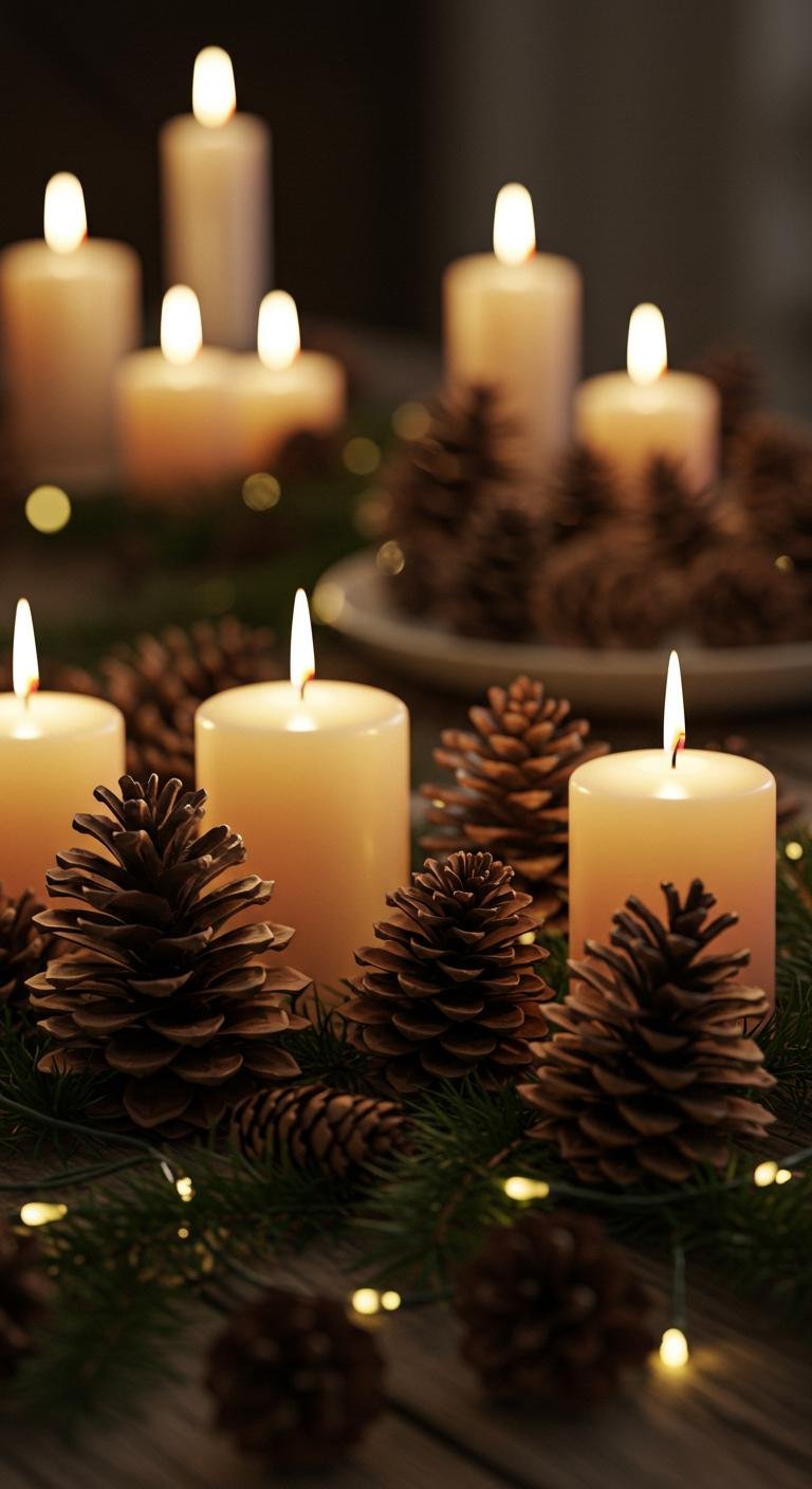 Creating a festive pinecone and candle arrangement is a delightful way to bring the warmth of the holiday season into your home. Begin with an enchanting pinecone design, mixing sizes and textures for visual interest. Secure candles safely among the pinecones, ensuring they’re stable and away from flammable materials. Your table will glow with holiday cheer and a touch of nature’s beauty!