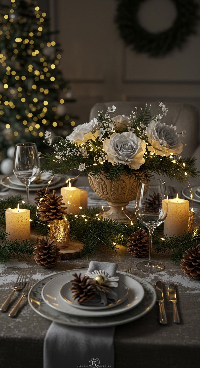 After embracing the natural charm of pinecones and candles, consider transforming your holiday table into a rustic winter wonderland with exquisite white flowers.
