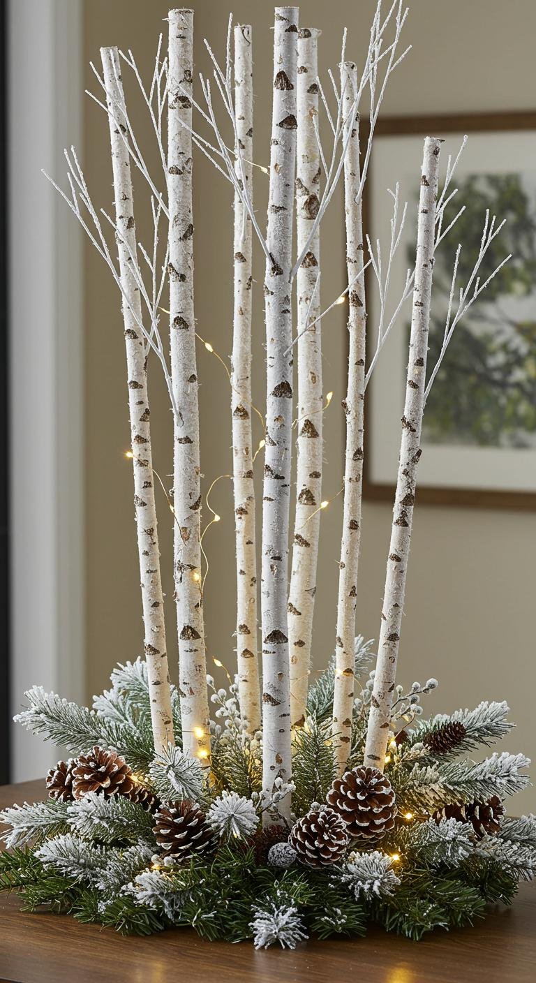 Transform your holiday table with a stunning snowy birch tree centerpiece that captures winter’s tranquility.