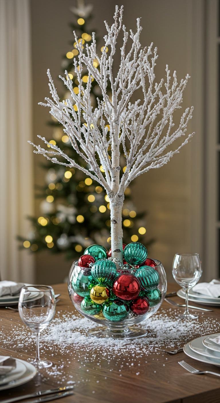 As the snowy birch tree centerpiece brings a serene winter charm to your table, colorful ornaments in a clear bowl add a vibrant pop that embodies the joy of the holiday season.