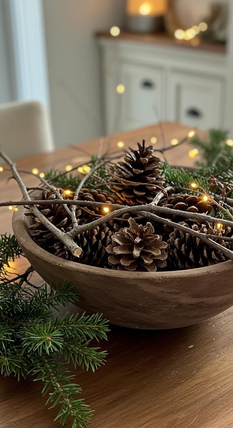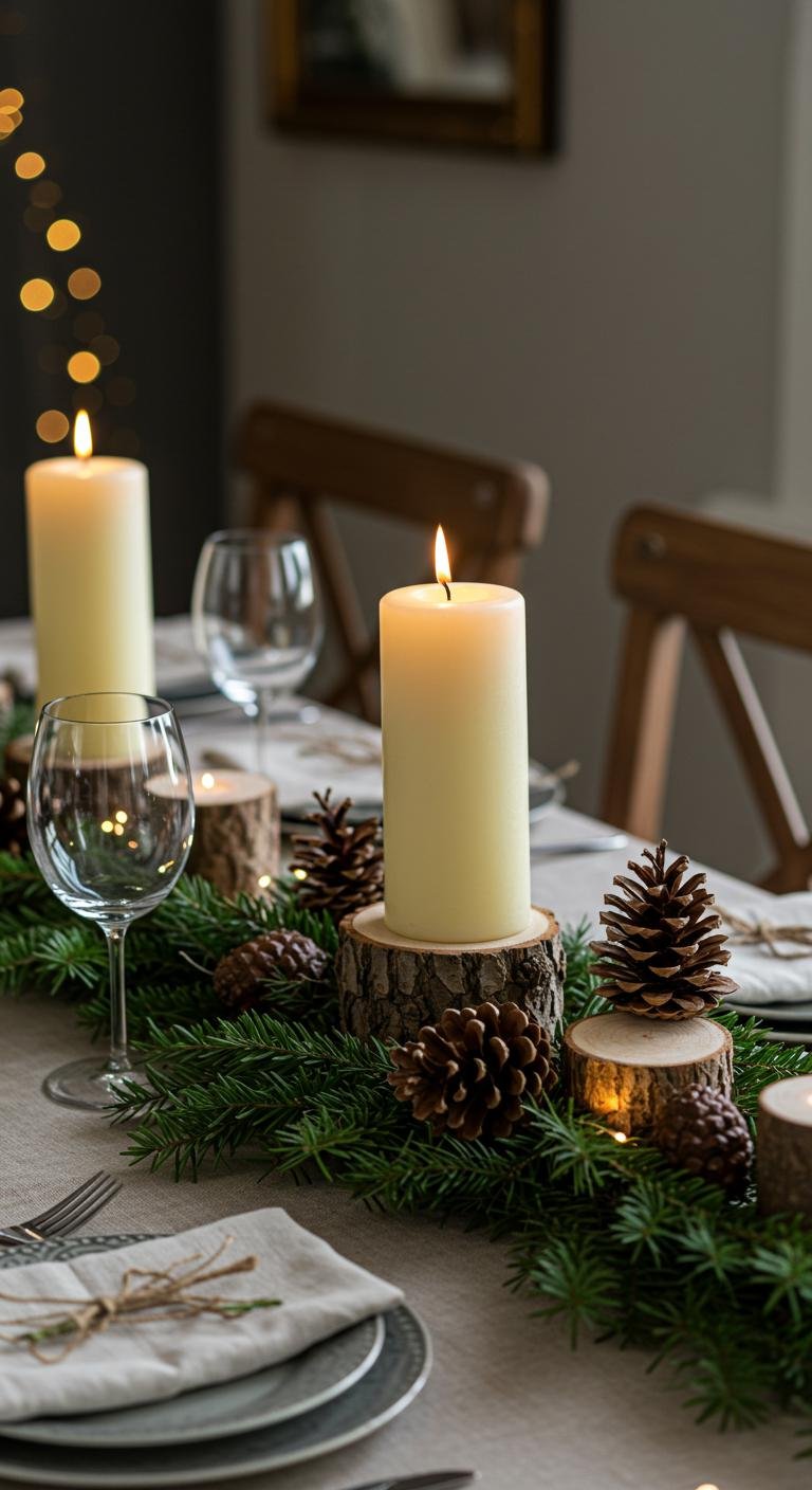 Incorporate minimalist decorations like simple greenery or pinecones for a sophisticated touch.