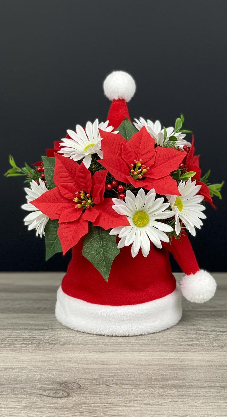 Add a playful touch to your holiday decor with a whimsical Santa hat floral arrangement.