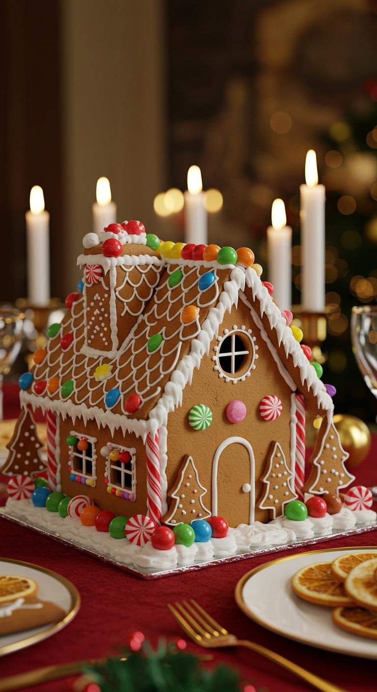 A gingerbread house centerpiece brings a delightful touch of nostalgia to your holiday table.