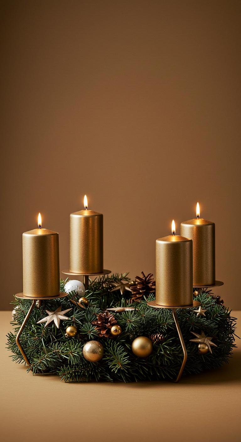 Use sleek modern candleholders to elevate your wreath, choosing geometric shapes and metallic finishes.