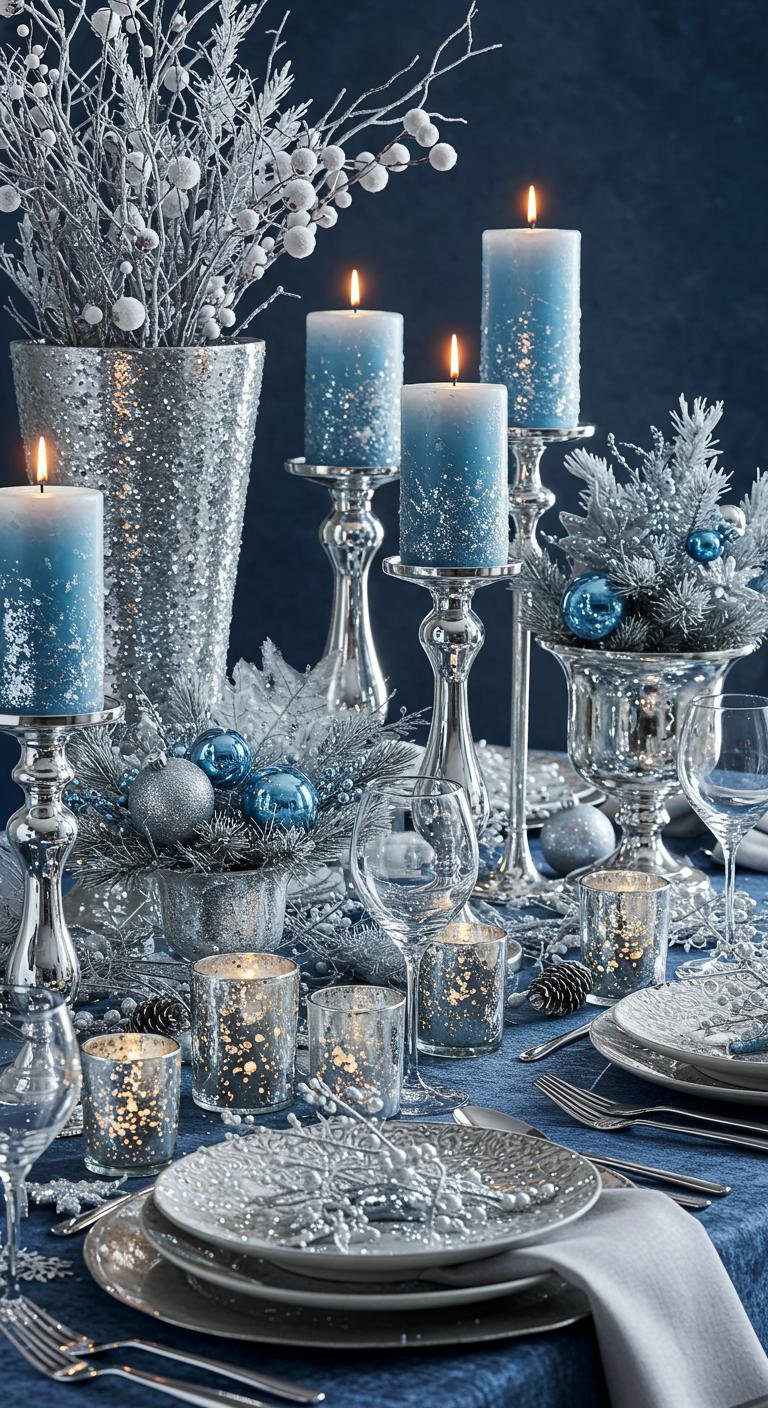 Use shimmering silver decor paired with stunning blue accents to create enchanting centerpieces. Incorporate frosted candles, metallic ornaments, and delicate white greens for a whimsical touch.
