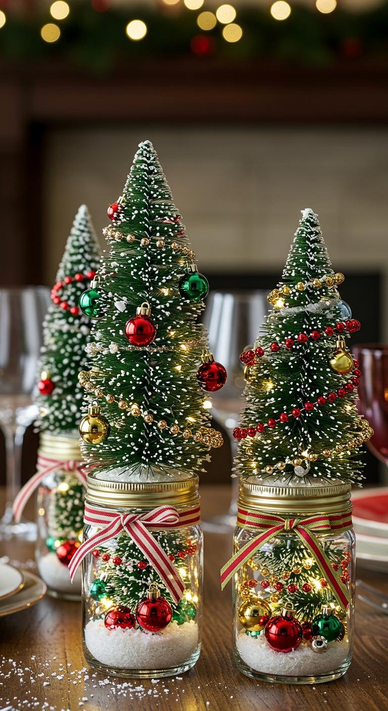 Mini Christmas trees in jars bring an enchanting touch to your holiday decor, making them an ideal centerpiece for any table.