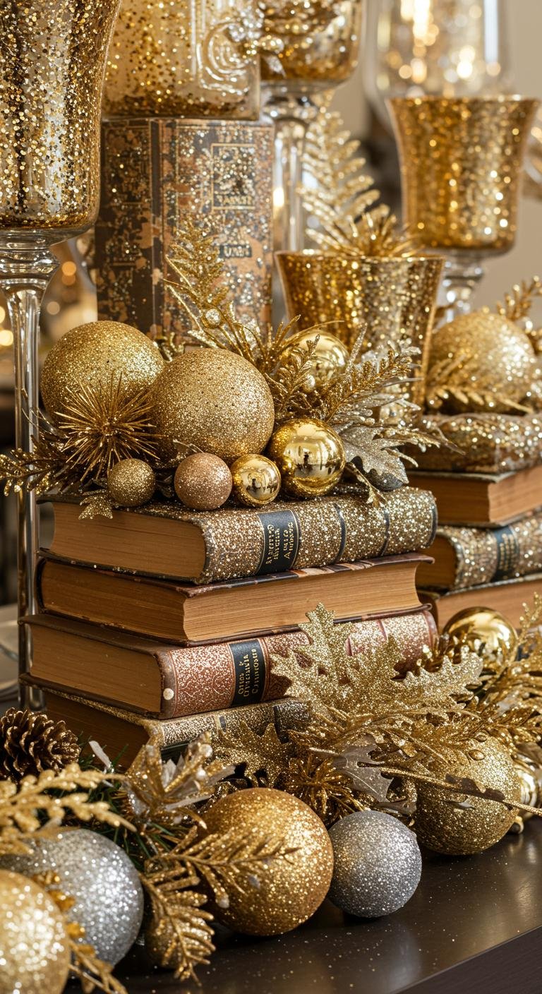 After adding the warmth of vintage books to your holiday decor, it’s time to elevate your centerpiece with a touch of glamour.